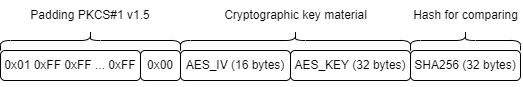 - Padding (PKCS#1 v1.5): Блок начинается со стандартного заголовка 0x00 0x01, за которым следуют байты заполнения 0xFF и нулевой байт-разделитель 0x00.