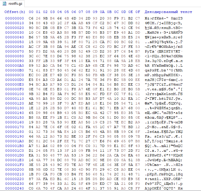 Для расшифровки мы можем воспользоваться утилитой openssl, предварительно вырезав последние 256 байт файла rootfs.gz.