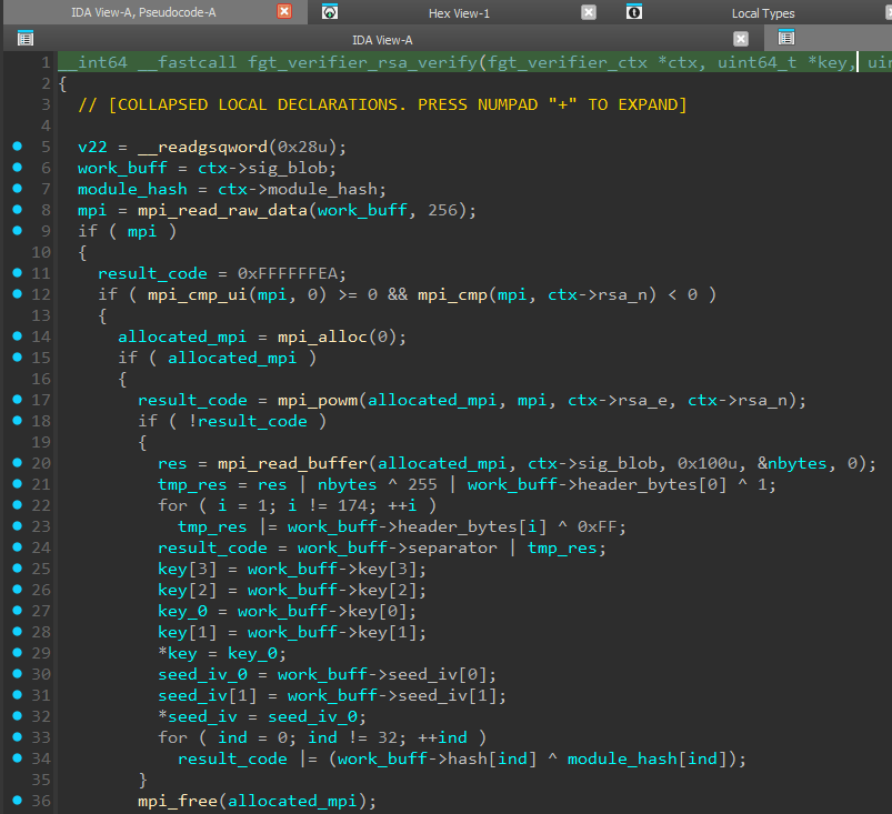 Имя функции и алгоритм позволяют утверждать, что используется RSA, однако теперь мы встретились со следующей проблемой: для расшифровки (проверки) подписи нам необходим публичный ключ, константы которого передаются через проприетарную структуру, которую мы назвали “fgt_verifier_ctx”