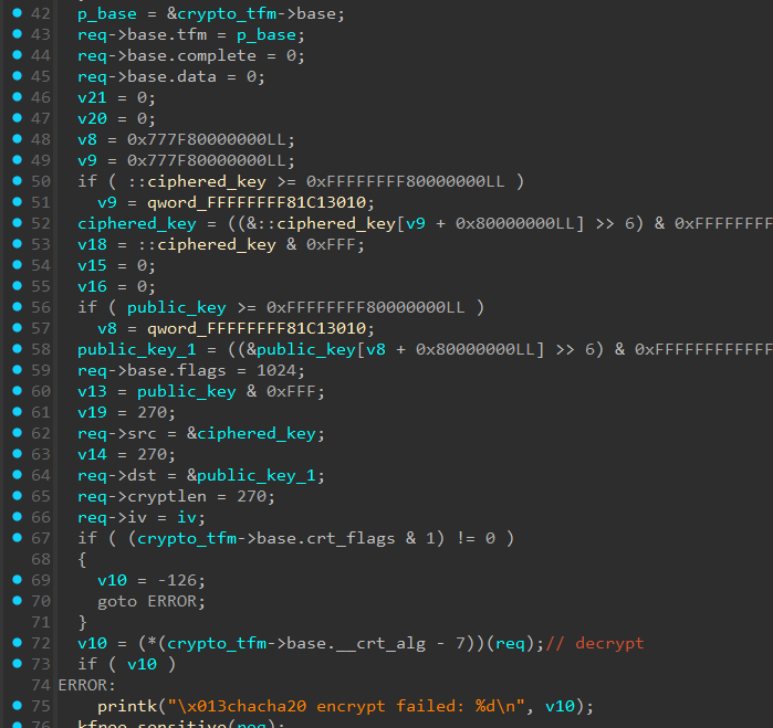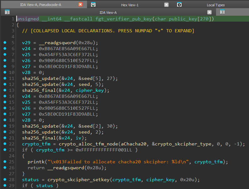 Функция fgt_verifier_pub_key, выполняет подготовку ключей и расшифровку публичного ключа RSA. Исходя из отладочных сообщений (строка 25) и первого аргумента функции crypto_alloc_tfm_node (строка 22), мы можем сделать вывод, что здесь используется алгоритм ChaCha20.